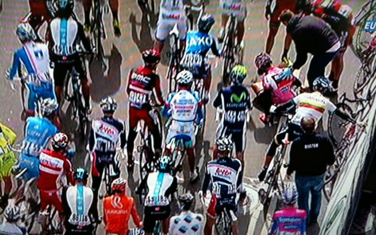 Tappa finita in volata , brutta caduta agli ultimi 100 mt che coinvolge molti alteti, tra cui Cavendish e Phinney ( a terra in foto )
