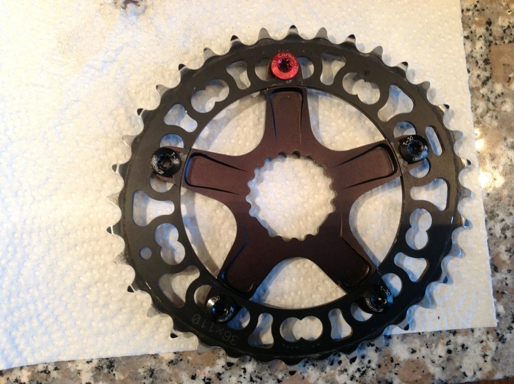 Uno spider da 110mm per Hollowgram, una corona ovale Rotor da 36T, cinque bussole.