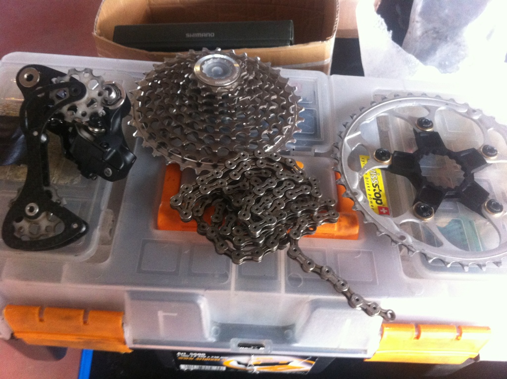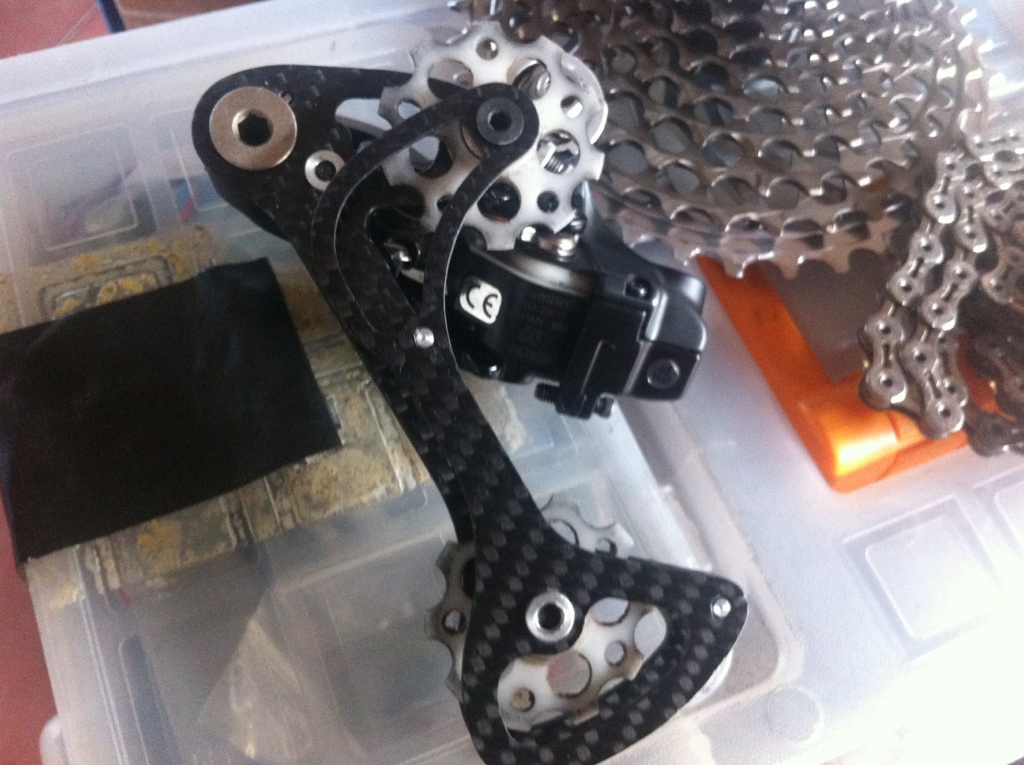 42 davanti Sugino 94mm BCD, ma poi arriverà una 46T con denti XX1 di Zeta Components 130mm BCD e cassetta XX 11-36 dietro su bici da strada con Di2 con gabbia carbon in stile K-Edge.